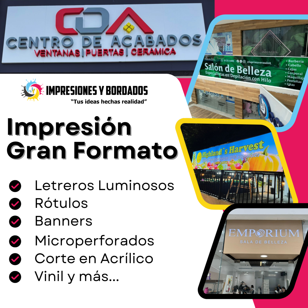 Ofrecemos un servicio de impresión en gran formato de alta calidad, ideal para publicidad, carteles, banners y más. Utilizamos tecnología avanzada y materiales duraderos para garantizar resultados vibrantes y resistentes a las inclemencias del tiempo. Nuestro equipo se encarga de cada detalle, desde el diseño hasta la entrega, para asegurar que tu proyecto se destaque y cumpla con tus expectativas. ¡Tus ideas hechas realidad!