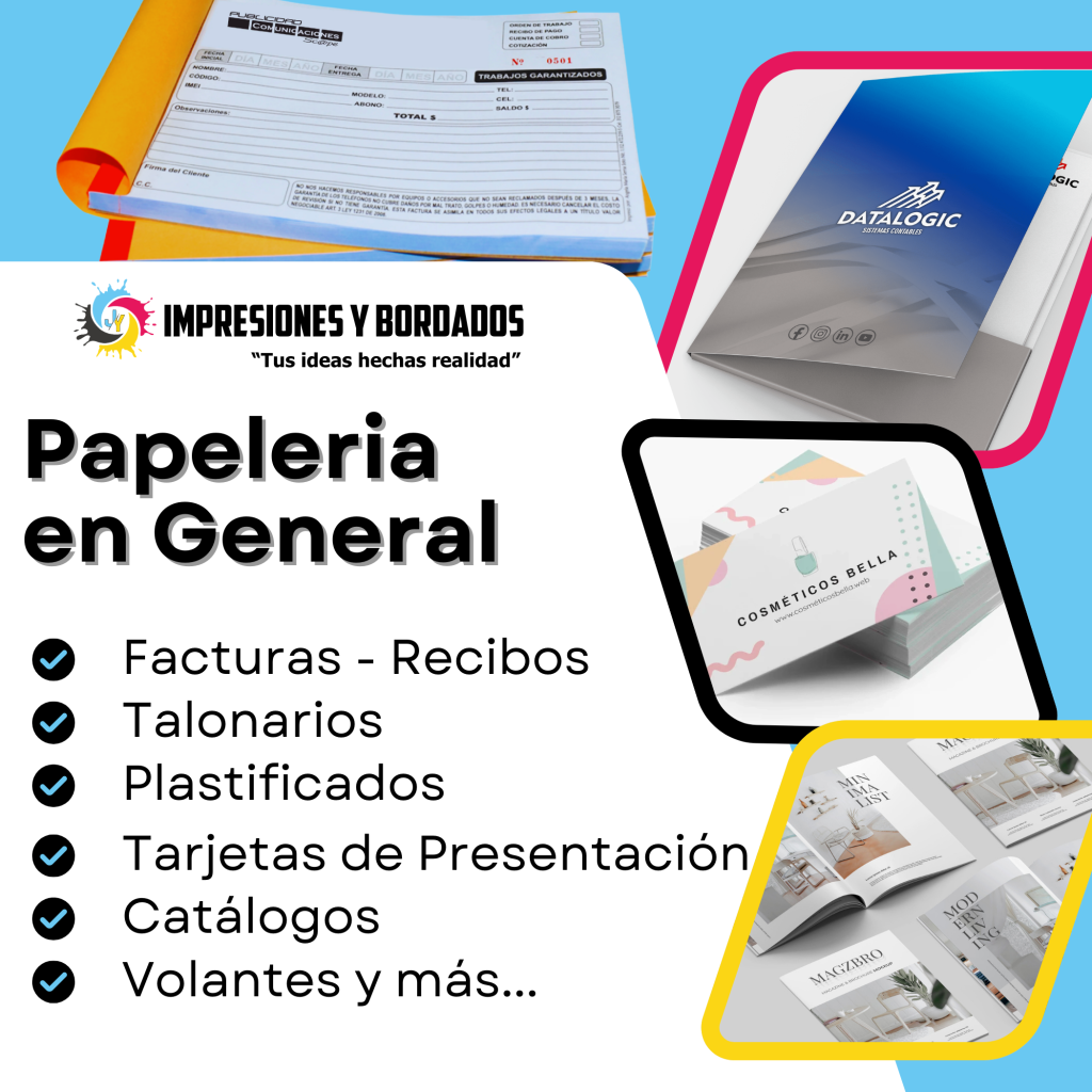Dentro de esta categoría tenemos: Facturas, Talonarios, Plastificados, Tarjeta de Presentación, Recibos, Catálogos, Volante y más.